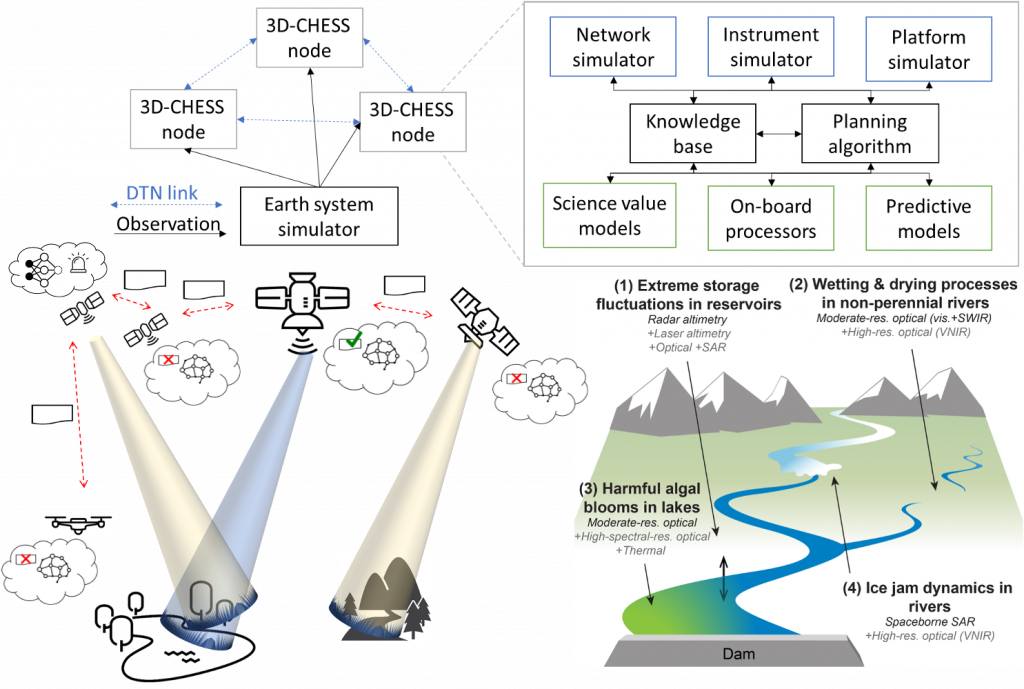 The project focused on a multi-sensor inland hydrologic and ecological monitoring system with three interdependent mission objectives: sediment transport during high-flow events, harmful algal blooms, and wetting/drying processes in intermittent rivers. The sensor web operates across heterogeneous platforms including satellites, UAVs, and ground stations, enabling autonomous, decentralized coordination without human intervention.