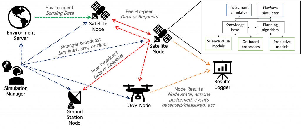 The team developed DMAS (Distributed Multi-Agent Simulation), a Python-based open-source tool for simulating heterogeneous sensor webs including satellite, UAV, and ground nodes. The architecture uses ZeroMQ messaging for peer-to-peer and broadcast communication, a centralized Environment Server for Earth state simulation, and a Simulation Manager for time synchronization. Each agent runs a multi-threaded architecture implementing sense–think–do loops plus optional science, engineering, and planning modules.