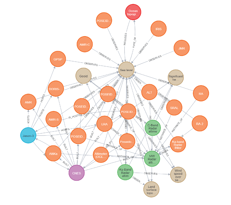 A Knowledge Graph (KG) built in Neo4j stores information about Earth observation satellites, their instruments, and the measurements they can generate, drawn primarily from the Committee on Earth Observing Satellites (CEOS) database. The KG contains 3,536 nodes and 15,193 relations. Additional sensor–observable triples were mined from IEEE TGARSS abstracts (1990–2020) using SciBERT for named entity recognition and SpaCy for entity linking. To handle noisy, automatically-extracted triples, the KG was extended to an Uncertain Knowledge Graph (UKG) with confidence scores, enabling inference via the UKGE embedding framework.